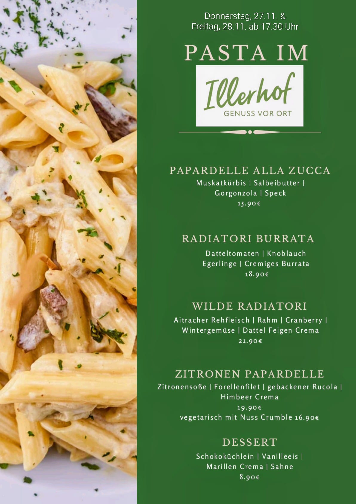 Am 27. und 28.11. findet wieder unser Pasta Abend im Illerhof jeweils ab 17:30 Uhr statt. Einfach zu unseren Öffnungszeiten unter 0176 32 92 1002 reservieren.was es gibt findet Ihr als Download in der kleinen Karte.